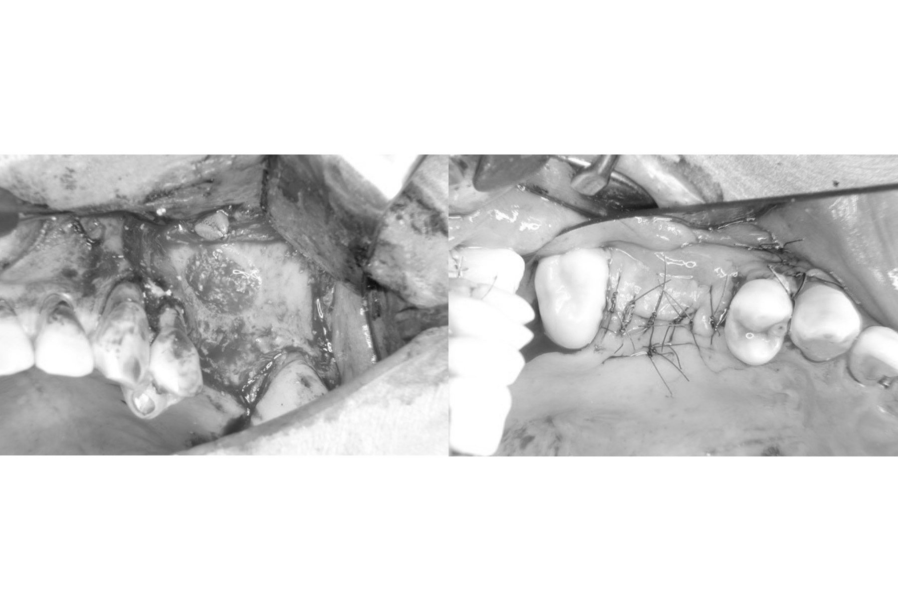 | 治療内容 | 通常インプラントは約8〜10mmの長さであり骨の厚みもその程度無いと治療は不可能である。今回骨は1〜2mmで薄かった為骨を大規模に増やす手術を行い10mm以上の骨を造成した。治癒後インプラント埋入手術を可能な状態にした。 |