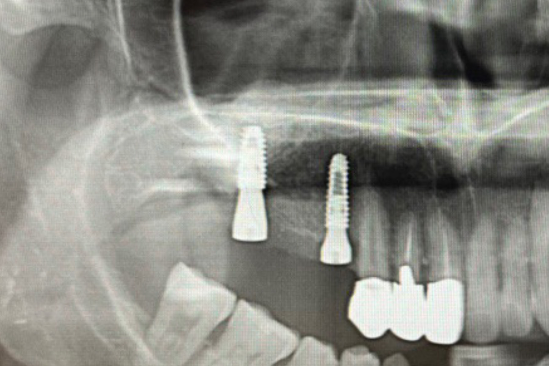 | 治療内容 | インプラント埋入手術を行うには骨が5mm程しかなく不可能な状態であった。その為骨を中規模に造成しインプラント埋入手術を行えるようにした。加えて患者負担を軽減する為に同日に骨造成手術とインプラント埋入手術を行い手術も1度で済んだ。 |