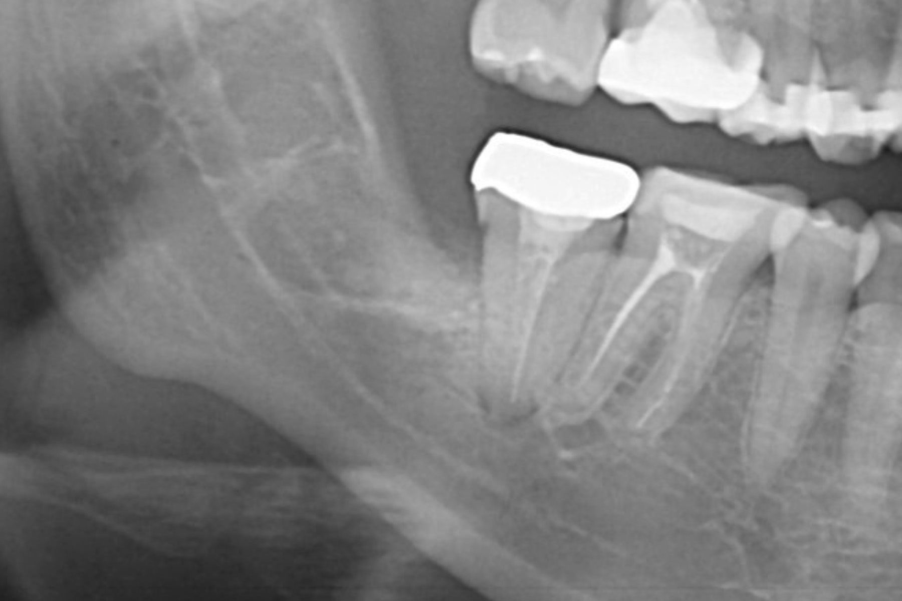 | 治療内容 | レントゲンにて親知らずは水平埋伏しており神経と近接していることがわかった。更に診査したところ神経損傷のリスクは高リスク群では無かった為説明し抜歯した。 |